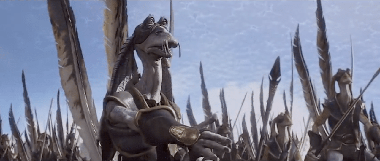…and is not, under any circumstance, the cruel, witless leader of a band of frowned-upon Noble Savages known most notoriously for sharing a common gene pool with one Jar Jar Binks, Bombad General. In 1998, which, according to the number of moments given away by this clip, was before people learned how to make a proper trailer, Jar Jar was practically promised by Lucas to be the world’s new best friend.