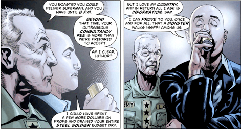As such, he seems truly vulnerable to Lex Luthor for the first time in, well, forever. Luthor, of course, isn’t the kind of person who questions himself. He recognizes Superman as an alien strain, believes him to be a threat to Earth’s native population, and will stop at nothing to have him taken out…so long as he’s paid an out-of-this-world consulting fee. Morrison has Luthor down perfectly as a calculated, never in over his head master tactician. While the world goes crazy around him and four-star generals bark at him over wasted money, Lex calmly sips his energy drink and orders the wrecking balls to move in on occupied apartment complexes, trying to smoke Superman out.